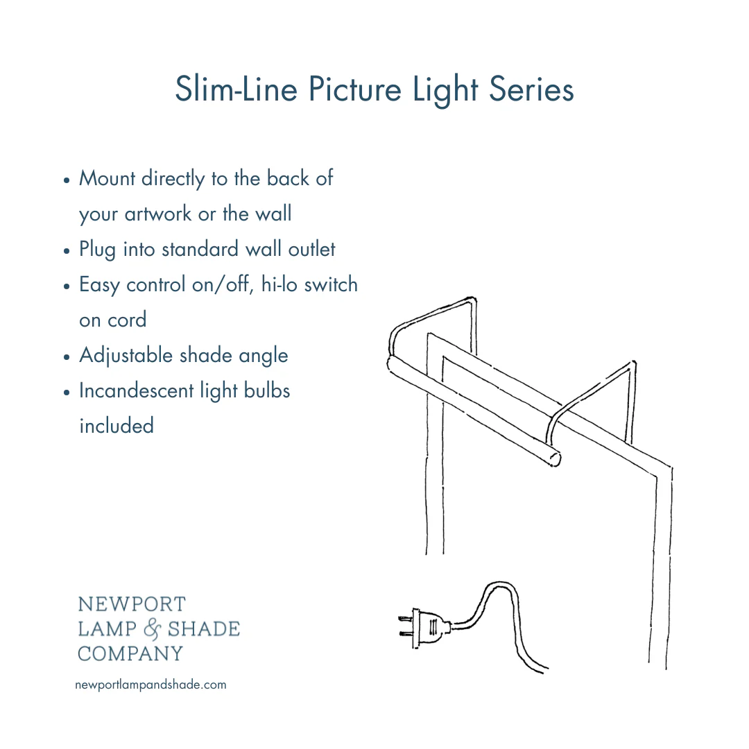 The Slim-Line Picture Light offers a sleek, refined designed that illuminates artwork without distraction. Its adjustable rotating head and in-line hi-lo switch provide versatile control and focused lighting, combining minimalist style with durable craftsmanship made in the USA.